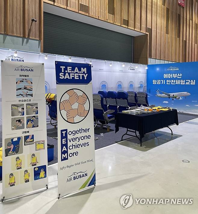 (서울=연합뉴스) 에어부산이 울산시 소방본부가 주최한 '2022 울산 119 안전문화축제'에 참여해 안전 교육 프로그램을 진행했다고 4일 밝혔다. 사진은 에어부산 항공기 안전체험교실 부스. 2022.10.4 [에어부산 제공. 재판매 및 DB 금지]