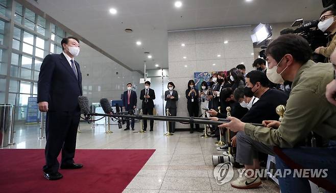 (서울=연합뉴스) 서명곤 기자 = 윤석열 대통령이 4일 오전 서울 용산 대통령실 청사로 출근, 취재진의 질문에 답하고 있다. 2022.10.4 [대통령실통신사진기자단]