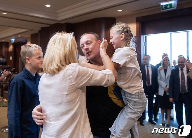 (터키 로이터=뉴스1) 김성식 기자 = 3일(현지시간) 터키에서 우크라이나 마리우폴의 아조우스탈 제철소 수비대 사령관 중 한 명인 데니스 슐레하가 가족을 만나 포옹하고 있다. 이날 회동 장소는 공개되지 않았다.