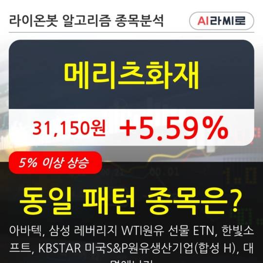 이 시각 거래소에서 메리츠화재 이외에도 아바텍(13.61%), 삼성 레버리지 WTI원유 선물 ETN(6.67%), 한빛소프트(9.03%), KBSTAR 미국S &P원유생산기업(합성 H)(6.02%), 대명에너지(5.4%) 등이 상승세를 보이고 있다.