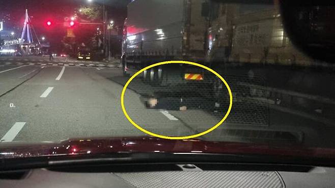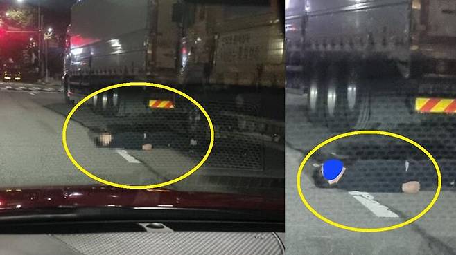 A 씨가 공개한 사진에는 한 남성이 대형 트럭 두 대 사이에 누운 채 머리는 차선에 걸치고 위험하게 잠을 자고 있었습니다.