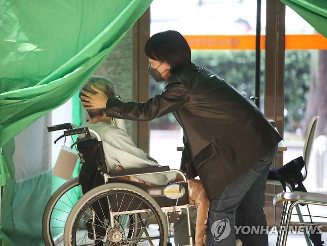 (광주=연합뉴스) 천정인 기자 = 감염취약시설의 대면 접촉 면회가 다시 가능해진 4일 오전 광주 북구 동행재활요양병원에서 입소자와 가족들이 면회하고 있다. 2022.10.4