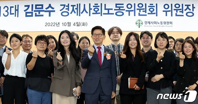 (서울=뉴스1) 박지혜 기자 = 김문수 신임 경제사회노동위원회 위원장이 4일 오전 서울 종로구 경제사회노동위원회 대회의실에서 열린 취임식에서 직원들과 기념 촬영을 하고 있다.