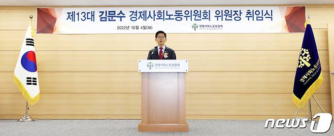 (서울=뉴스1) 박지혜 기자 = 김문수 신임 경제사회노동위원회 위원장이 4일 오전 서울 종로구 경제사회노동위원회 대회의실에서 열린 취임식에서 취임사를 하고 있다.