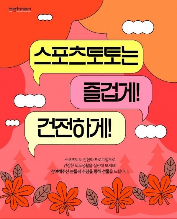 국민체육진흥공단에서 발행하는 체육진흥투표권 스포츠토토의 공식 온라인 발매 사이트 베트맨이 10월 건전화 이벤트인 '스포츠토토는 즐겁게! 건전하게!'를 지난 1일(토)부터 오는 31일(월)까지 한 달간 실시한다.