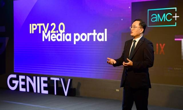 강국현 KT 커스터머사업부문장 사장이 4일 서울 중구 노보텔 앰버서더 서울 동대문에서 IPTV 서비스 ‘지니 TV' 출시 기념 기자간담회에서 발표를 하고 있다.