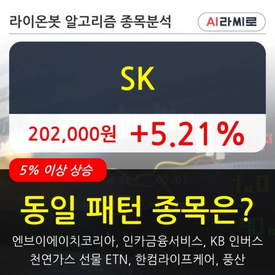 이 시각 거래소에서 SK 이외에도 엔브이에이치코리아(7.37%), 인카금융서비스(5.03%), KB 인버스 천연가스 선물 ETN(5.18%), 한컴라이프케어(8.33%), 풍산(7.41%) 등이 상승세를 보이고 있다.