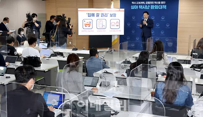 [이데일리 방인권 기자] 원희룡 국토교통부 장관이 4일 서울 종로구 정부서울청사에서 '택시 규제개혁, 모빌리티 혁신을 통한 심야 택시난 완화대책'을 발표하고 있다.