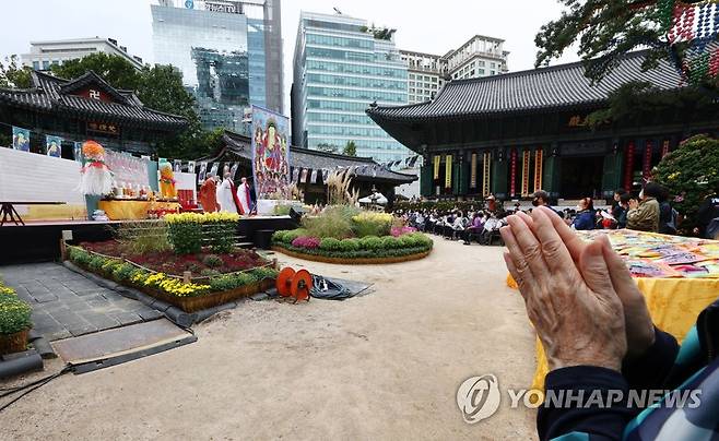 (서울=연합뉴스) 김인철 기자 = 4일 오전 서울 종로구 조계사 대웅전 앞에서 중양절 수륙재가 봉행되고 있다.