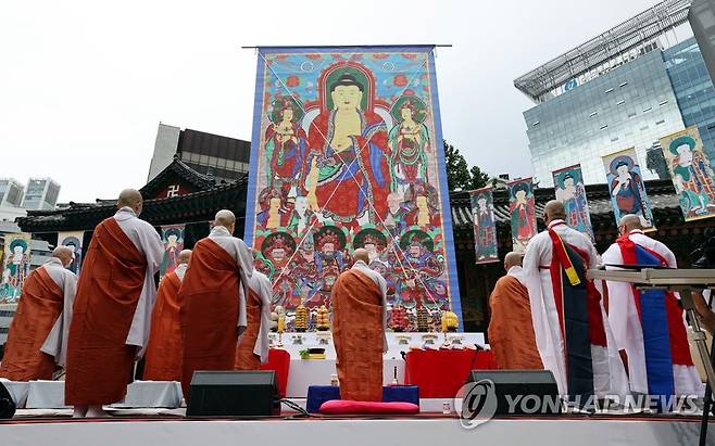 (서울=연합뉴스) 김인철 기자 = 4일 오전 서울 종로구 조계사 대웅전 앞에서 중양절 수륙재가 봉행되고 있다.