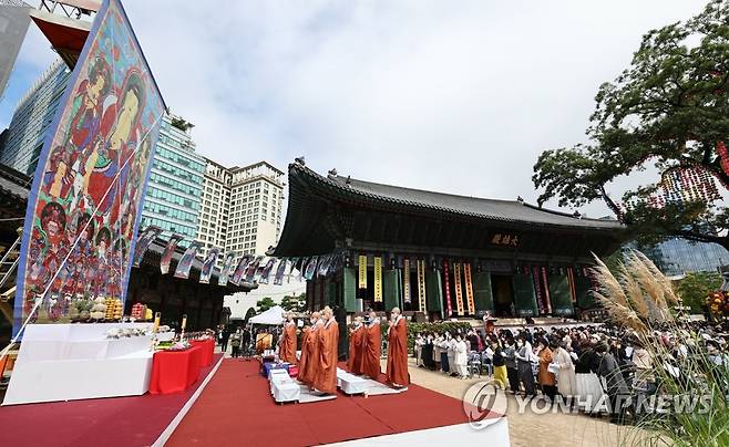 (서울=연합뉴스) 김인철 기자 = 4일 오전 서울 종로구 조계사 대웅전 앞에서 중양절 수륙재가 봉행되고 있다.