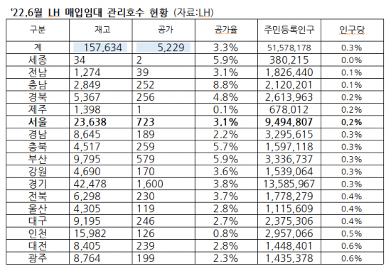 4일 국회 국토교통위원회 소속 김병욱 의원이 LH로부터 받은 자료에 따르면, LH가 직접 지어 공급하는 서울 지역 건설임대의 경우 인구당 관리호수 비율이 0.3%에 그치는 것으로 집계됐다.