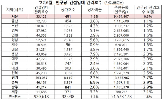 6월 기준 서울 지역 건설임대 관리호수는 3만3123호로, 주민등록인구(949만4807명)를 고려한 인구당 관리호수 비율은 0.3%를 기록했다.