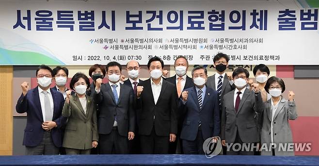 (서울=연합뉴스) 오세훈 서울시장이 4일 서울시청에서 열린 서울특별시 보건의료협의회 출범식에서 참석자들과 기념 촬영하고 있다. 2022.10.4 [서울시 제공. 재판매 및 DB 금지]