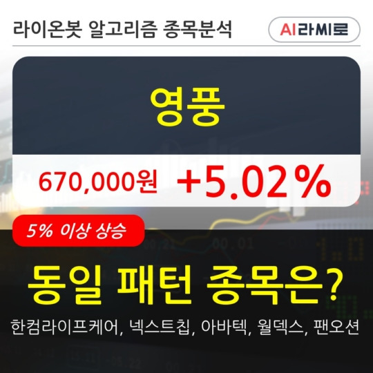 이 시각 거래소에서 영풍 이외에도 한컴라이프케어(22.22%), 넥스트칩(7.07%), 아바텍(17.72%), 월덱스(7.19%), 팬오션(6.67%) 등이 상승세를 보이고 있다.