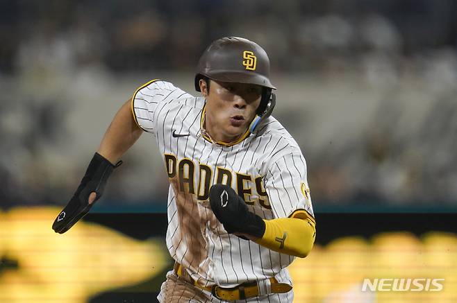 [샌디에이고=AP/뉴시스] 샌디에이고 파드리스 김하성이 3일(현지시간) 미 캘리포니아주 샌디에이고의 펫코파크에서 열린 2022 메이저리그 샌프란시스코 자이언츠와의 경기 1회 말 몸에 맞는 볼로 출루, 2루 도루 후 후속 타자 땅볼에 3루로 진루하고 있다. 김하성은 3타수 1안타 1사구 1도루를 기록했고 샌디에이고는 7-4로 승리했다. 2022.10.04.