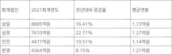 4대 회계법인 직원의 평균연봉은 삼일이 1억7344만원으로 가장 많았고, 삼정(1억2718만원)과 한영(1억2155만원), 안진(1억1454만원) 등의 순이었다. 5억원 이상 받은 회계사는 2020회계연도 58명에서 2021회계연도 128명으로 120% 급증했다. 삼일이 57명으로 가장 많았고, 삼정이 51명으로 뒤를 따랐다. 한영은 11명, 안진은 9명이었다.