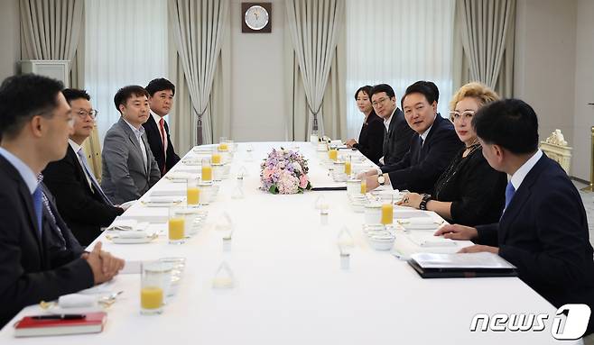 (서울=뉴스1) 오대일 기자 = 윤석열 대통령이 4일 용산 대통령실 청사에서 열린 한·미 스타트업 서밋과 K-브랜드 엑스포 참여 중소벤처기업 오찬 간담회에서 참석자들과 대화하고 있다. (대통령실 제공) 2022.10.4/뉴스1