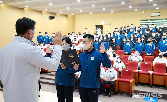 [홍성=뉴시스] 유효상 기자 = 제103회 전국체육대회가 오는 7일부터 7일간 울산광역시 일원에서 개최되는 가운데 충남선수단(49개 종목, 임원·선수 1788명 참가)이 4일 충남도서관에서 필승을 다짐하는 선서를 하고 있다. (사진=충남도 제공) 2022.10.04 photo@newsis.com