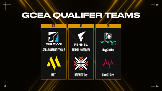 오는 12일부터 16일까지 진행되는 동아시아 선발전에는 한국 대표 스피어 게이밍과 MBTI, 일본의 페넬 호텔라바(FENNEL HOTELAVA)와 리이그나이트 릴리(Reignite Lily), 중국의 옥시즈니어스(Oxyg3niOus)와, 샹시 게이밍 걸즈(ShanXi Gaming Girls)가 참가한다.