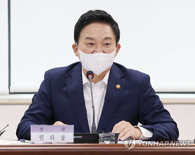 (서울=연합뉴스) 류영석 기자 = 원희룡 국토교통부장관이 4일 오후 서울 여의도 주택도시보증공사 서부주택도시금융센터에서 열린 관리비 투명화 및 사각지대 해소를 위한 간담회에 참석해 인사말을 하고 있다. 2022.10.4