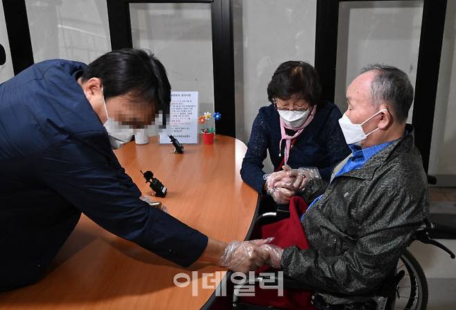 [이데일리 김태형 기자] 감염취약시설의 대면 접촉 면회가 다시 가능해진 4일 서울 시립서부노인전문요양센터에서 입소자와 가족이 면회를 하고 있다. 사진공동취재단.