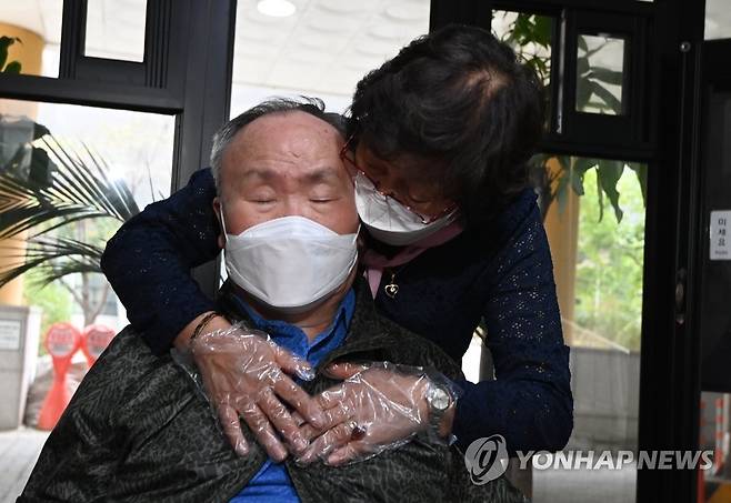 (서울=연합뉴스) 요양병원·시설 등 감염취약시설의 대면 접촉 면회가 다시 가능해진 4일 오후 마포구 서울시립 서부노인전문요양센터에서 한 입소자 가족이 대면 면회를 하고 있다. 2022.10.4 [사진공동취재단]
