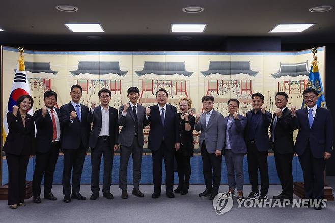 (서울=연합뉴스) 서명곤 기자 = 윤석열 대통령이 4일 서울 용산 대통령실 청사에서 열린 '한·미 스타트업 서밋과 K-브랜드 엑스포 참여 중소벤처기업 오찬 간담회'에서 참석자들과 기념촬영을 하고 있다. 2022.10.4 [대통령실 제공, 재판매 및 DB 금지]