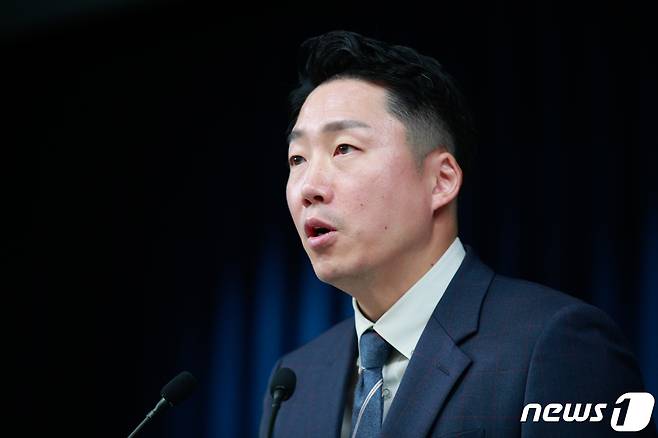 (서울=뉴스1) 안은나 기자 = 이재명 부대변인이 4일 오후 용산 대통령실에서 한미일 안보실장 간 전화통화, 윤석열 대통령 지시사항 등 현안 관련 브리핑을 하고 있다. 2022.10.4/뉴스1