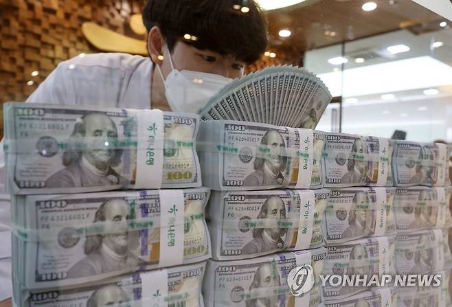 (서울=연합뉴스) 류영석 기자 = 원/달러 환율이 달러당 1,430원선에서 등락 중인 가운데 4일 오전 서울 중구 을지로 하나은행 본점 위변조대응센터에서 직원이 달러화를 정리하고 있다. 2022.10.4