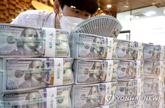 (서울=연합뉴스) 류영석 기자 = 원/달러 환율이 달러당 1,430원선에서 등락 중인 가운데 4일 오전 서울 중구 을지로 하나은행 본점 위변조대응센터에서 직원이 달러화를 정리하고 있다. 2022.10.4