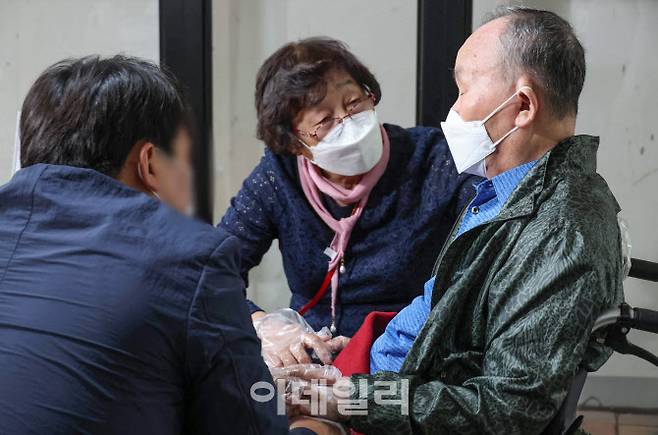 [이데일리 김태형 기자] 감염취약시설의 대면 접촉 면회가 다시 가능해진 4일 서울 시립서부노인전문요양센터에서 입소자와 가족이 면회를 하고 있다. 사진공동취재단.