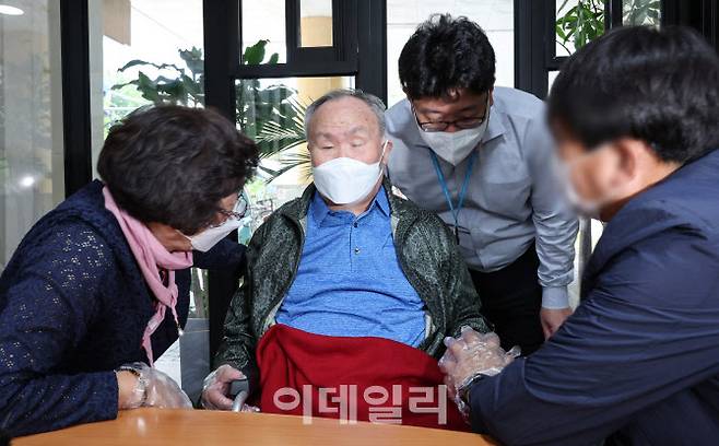 [이데일리 김태형 기자] 감염취약시설의 대면 접촉 면회가 다시 가능해진 4일 서울 시립서부노인전문요양센터에서 입소자와 가족이 면회를 하고 있다. 사진공동취재단.