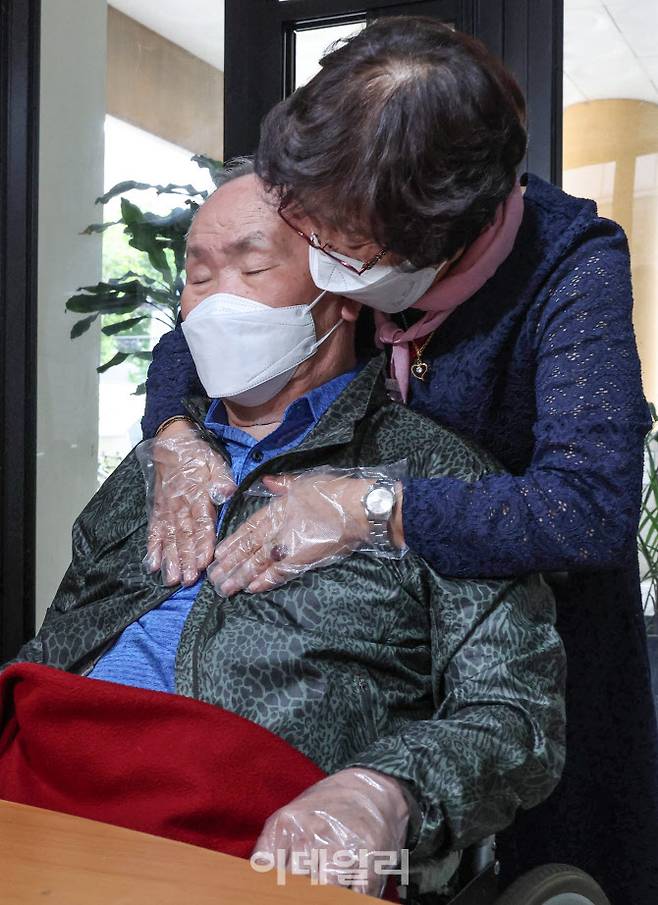 [이데일리 김태형 기자] 감염취약시설의 대면 접촉 면회가 다시 가능해진 4일 서울 시립서부노인전문요양센터에서 입소자와 가족이 면회를 하고 있다. 사진공동취재단.
