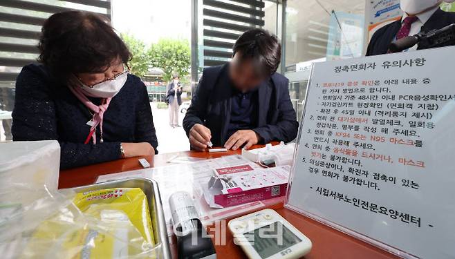 [이데일리 김태형 기자] 감염취약시설의 대면 접촉 면회가 다시 가능해진 4일 서울 시립서부노인전문요양센터에서 한 입소자의 가족이 면회 전 신속항원검사를 받고 있다. 사진공동취재단.