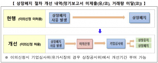 거래소는 정기보고서 미제출과 거래량 미달로 인한 상장폐지 사유가 발생하면 이의신청을 허용하고 사유 해소의 기회를 부여할 방침이다. 정기보고서 미제출은 코스피와 코스닥 모두에 대해, 거래량 미달은 코스닥 시장에 한정해 적용된다.