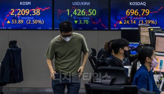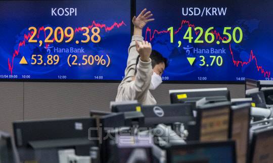 코스피가 전 거래일보다 53.89포인트 오른 2209.38로 장을 마친 4일 서울 중구 하나은행 딜링룸에서 직원들이 분주히 업무를 보고 있다. 이날 코스닥은 24.14포인트 오른 696.79, 원·달러 환율은 3.7원 하락한 1426.5원으로 마감했다.