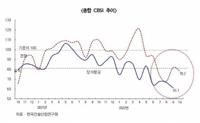 다만 10월 지수는 9월보다 17.1포인트 상승한 78.2를 기록하며 소폭 회복할 것으로 전망됐다. 박 연구위원은 “10월 신규 공사 수주는 늘겠지만 기업들은 자금 조달에 어려움을 느낄 것”이라며 “이에 CBSI도 70선에 머물며 부진한 모습을 이어갈 것”이라고 설명했다.