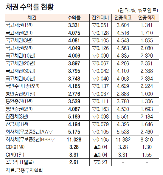 [데이터로 보는 증시]채권 수익률 현황(10월 4일)