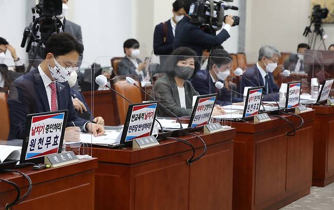 | ▲ 4일 국회에서 열린 교육위원회의 교육부, 국사편찬위원회 등에 대한 국정감사에서 국민의힘 의원들이 김건희 논문표절 증인 채택 관련 '폭력적 강행처리 민주당 사과하라!'는 문구가 적힌 피켓 등을 컴퓨터에 붙여놓고 있다. |