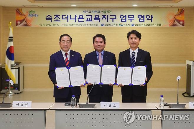 (속초=연합뉴스) 4일 속초양양교육지원청에서 열린 '2023 더 나은 교육지구 업무 협약식'에서 이병선 속초시장, 신경호 강원도교육감, 이규형 속초양양교육지원청 교육장(왼쪽부터)이 기념사진을 촬영하고 있다.