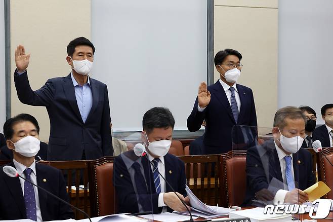 (서울=뉴스1) 유승관 기자 = 이강덕 포항시장(왼쪽)과 최정우 포스코그룹 회장이 4일 서울 여의도 국회 행정안전위원회에서 열린 행정안전부·인사혁신처·공무원연금공단에 대한 국정감사에 증인으로 출석해 증인 선서를 하고 있다. (공동취재) 2022.10.4/뉴스1