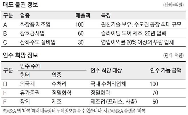 제조업체 F사는 프레스·사출 관련 업체, 대구·경북 지역 제조업체 인수를 타진하고 있다. 영업이익이 꾸준하며 자사 공장을 소유한 업체, 제품과 기술력은 좋으나 영업력이 약한 업체 등을 선호한다. 인수에 활용할 수 있는 최대 금액은 50억원이다.