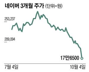이날 유가증권시장(코스피)에서 네이버는 8.79% 하락한 17만6500원에 거래를 마쳤다. 장중 52주 신저가를 새로 쓰며 19만원 선을 내주고 곧장 17만원대로 추락했다. 네이버가 종가 기준 18만원 선 밑으로 내려간 것은 2020년 4월 21일(17만8500원) 이후 처음이다. 외국인 투자자들이 네이버를 3100억원 넘게 순매도하며 주가를 끌어내렸다.