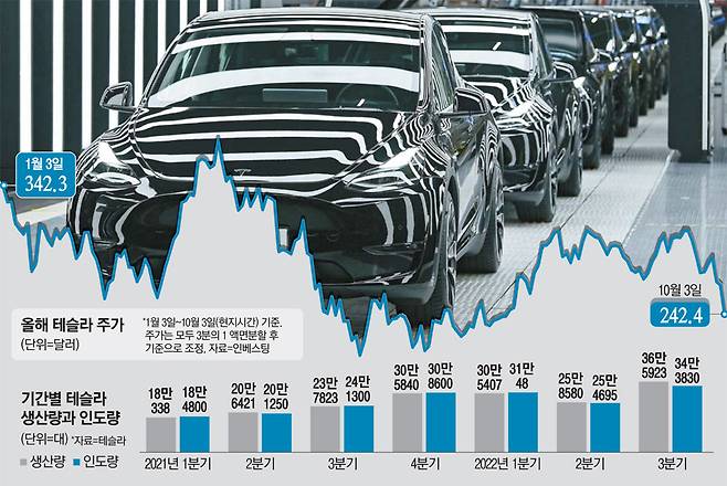 3일(현지시간) 테슬라는 지난 3분기에 인도량 34만3830대와 생산량 36만5923대를 기록했다고 밝혔다. 인도량이 팩트셋 기준 월가 전망치였던 37만1000대에 크게 미달하며 주가가 8.61% 폭락했다. 이날 나스닥종합지수와 S&P500지수가 각각 2.27%, 2.59% 반등하며 뉴욕 증시는 상승했지만 테슬라는 웃지 못했다.