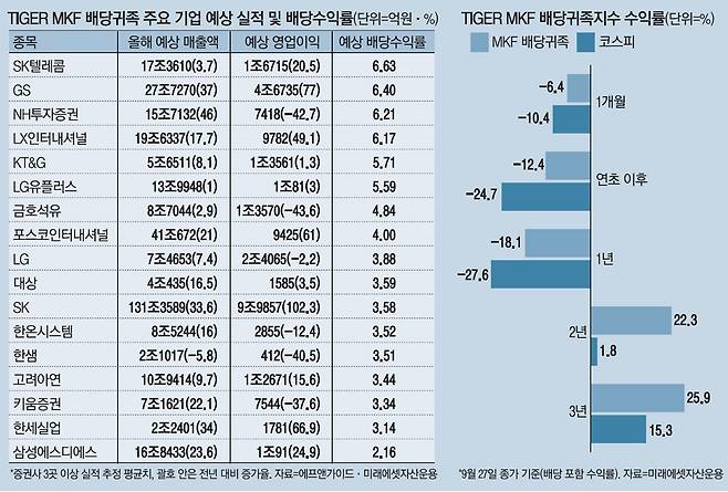 이처럼 실적에 기반한 높은 수준의 배당은 '투자 안전판' 역할을 한다. ETF는 보유 주식의 배당을 모은 '분배금'을 투자자들에게 지급한다. 주식 보유 시 배당금을 받는 것처럼 분배금 지급 전 ETF를 보유하면 지급받을 수 있다. 미래에셋자산운용에 따르면 지난해 MKF 배당귀족지수에 속한 30개 기업의 연평균 배당수익률은 연 3.92%로 코스피 기업 평균 배당수익률(1.82%)의 2배가 넘는다. TIGER MKF ETF는 발생한 이익을 기반으로 분배금을 매년 1·4·7·10월 말에 지급할 예정이다.