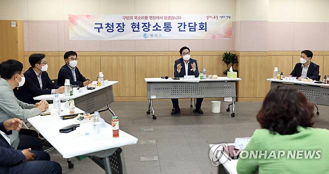 (서울=연합뉴스) 박일하 동작구청장이 4일 서울 동작구 사당1동 주민센터에서 열린 현장소통 간담회를 주재하고 있다. 2022.10.4 [동작구 제공. 재판매 및 DB 금지]
