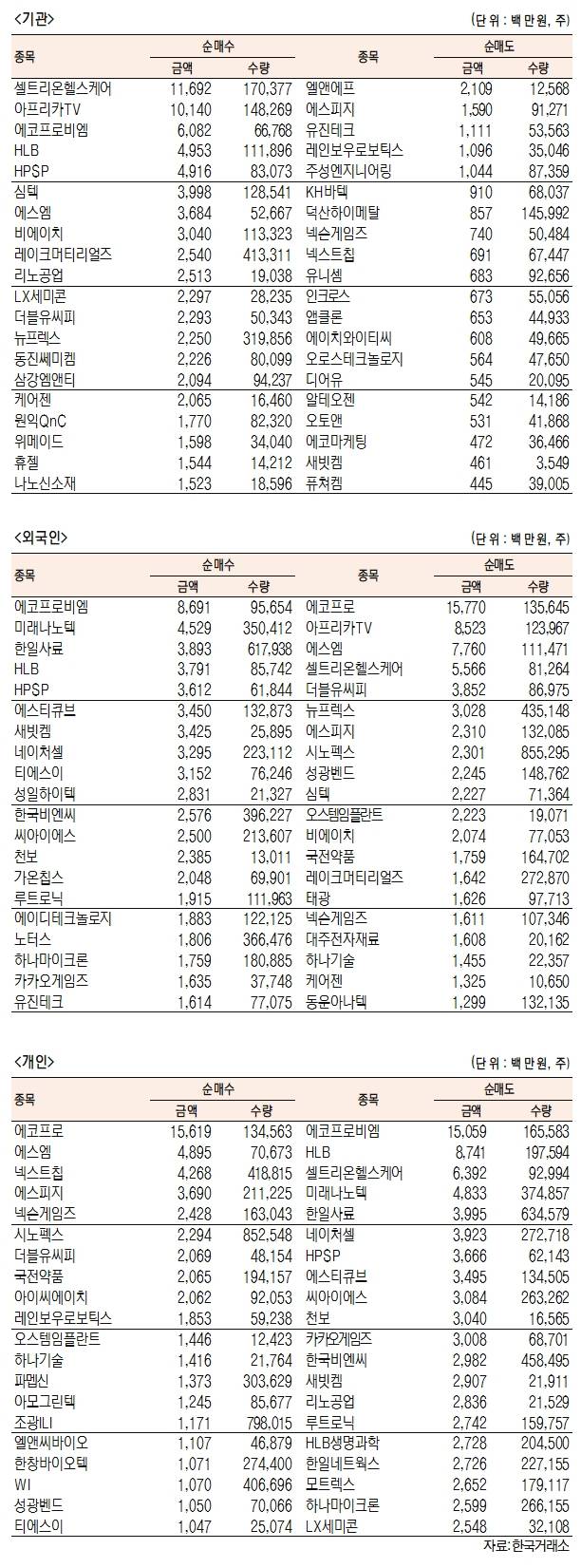 - [표]주간 코스닥 기관·외국인·개인 순매수·도 상위종목(9월 26일~30일)