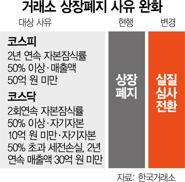 우선 자동으로 상장폐지 대상 요건이 됐던 재무적 사유가 대폭 완화된다. 코스피 상장사는 그동안 2년 연속 자본잠식률이 50% 이상이거나 2년 연속 매출액 50억 원 미만이면 상장폐지됐다. 코스닥 상장사는 2회 연속 자본잠식률 50% 이상, 2회 연속 자기자본 10억 원 미만, 2년 연속 매출액 30억 원 미만, 2회 연속 자기자본 50% 초과 세전 손실이 발생하면 자동 상장폐지됐다. 하지만 앞으로는 기업심사위원회와 시장위원회 등의 실질 심사를 거쳐 회생 가능성이 있는지를 복합적으로 살핀 뒤 상장폐지 여부를 결정한다.