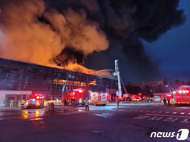 (구미=뉴스1) 최창호 기자 = 4일 오후 5시25분쯤 경북 구미시 4공단에 있는 공장건물에서 불이 났다.신고를 받은 소방당국은 대응1단계에 이어 2단계로 격상하고 펌프차 등 장비 46대와 100명을 투입 진화작업을 벌이고 있다.(경북소방본부제공)2022.10.4/뉴스1